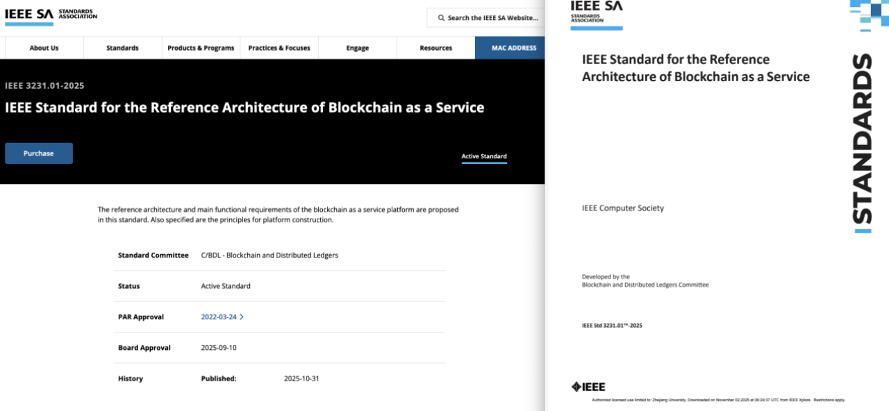 · IEEE Std 3231.01-2025《IEEE Standard for the Reference Architecture of Blockchain as a Service》(区块链即服务参考架构标准)