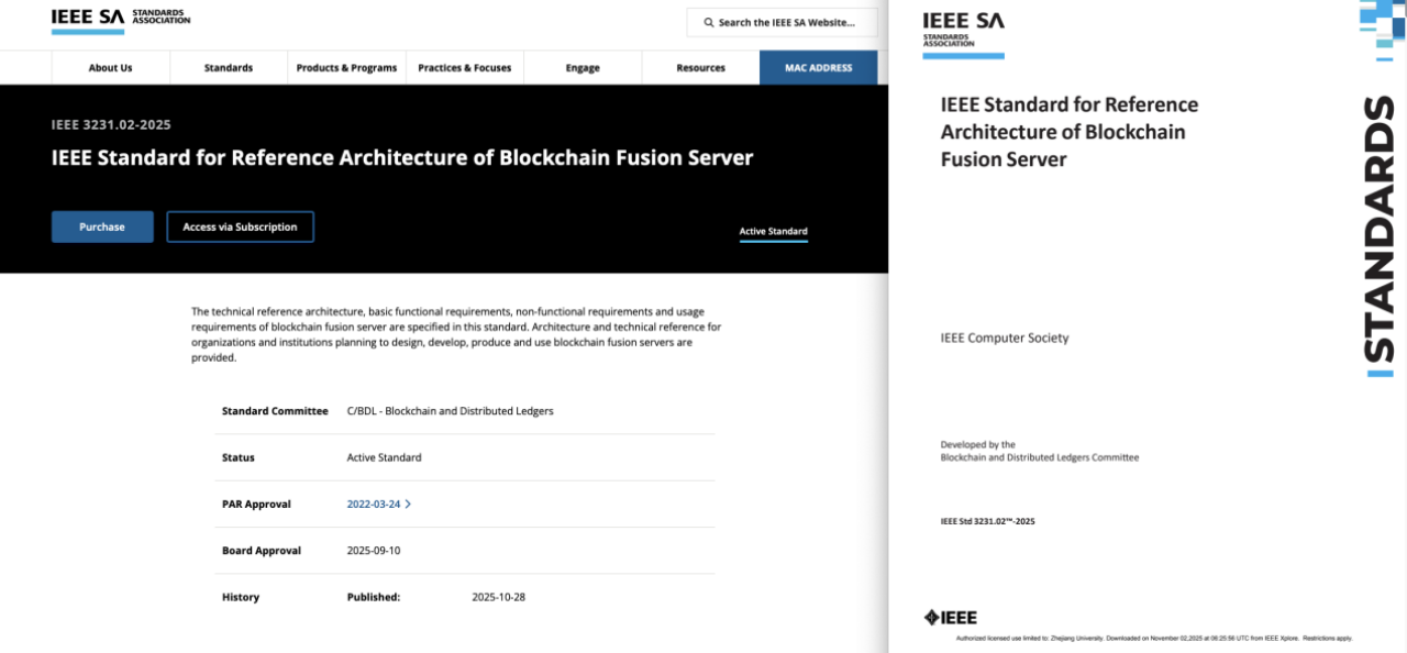 2025年10月28日和31日,IEEE标准协会 (Institute of Electrical and Electronics Engineers Standards Association, IEEE SA) 正式发布由趣链科技牵头制定的两项国际标准,标志着我国在数字技术国际标准化工作中再度取得重要突破: