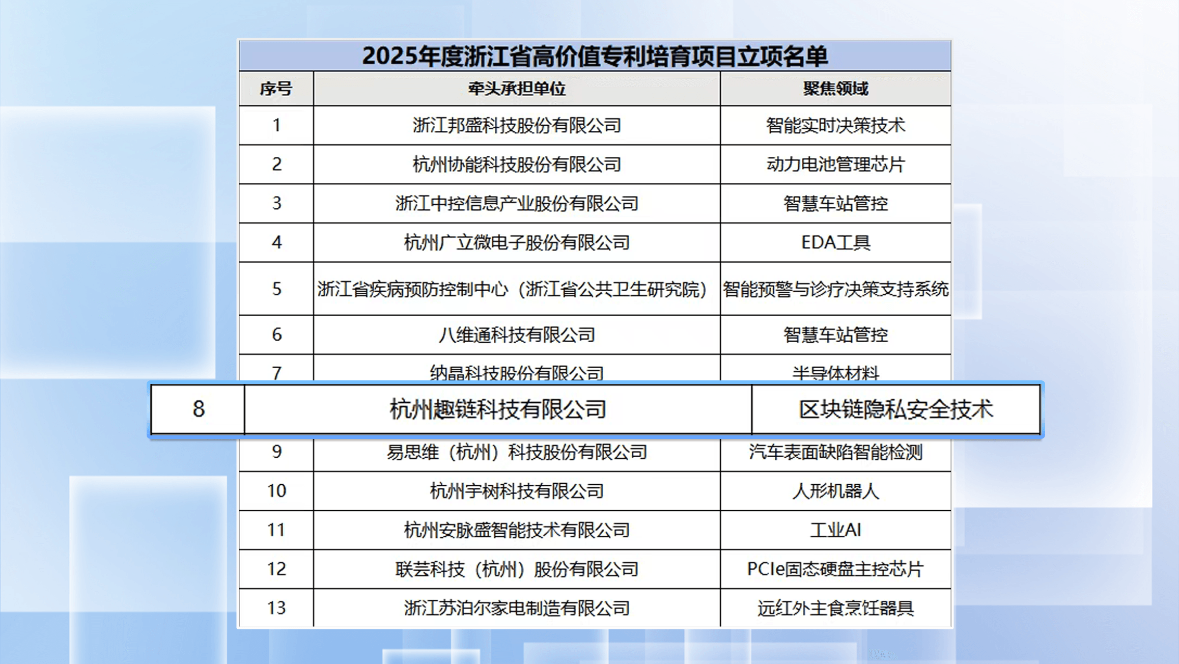 近日,2025年度浙江省高价值专利培育平台和项目立项名单公布,趣链科技凭借在区块链隐私安全领域的卓越表现成功入选高价值专利培育项目。
