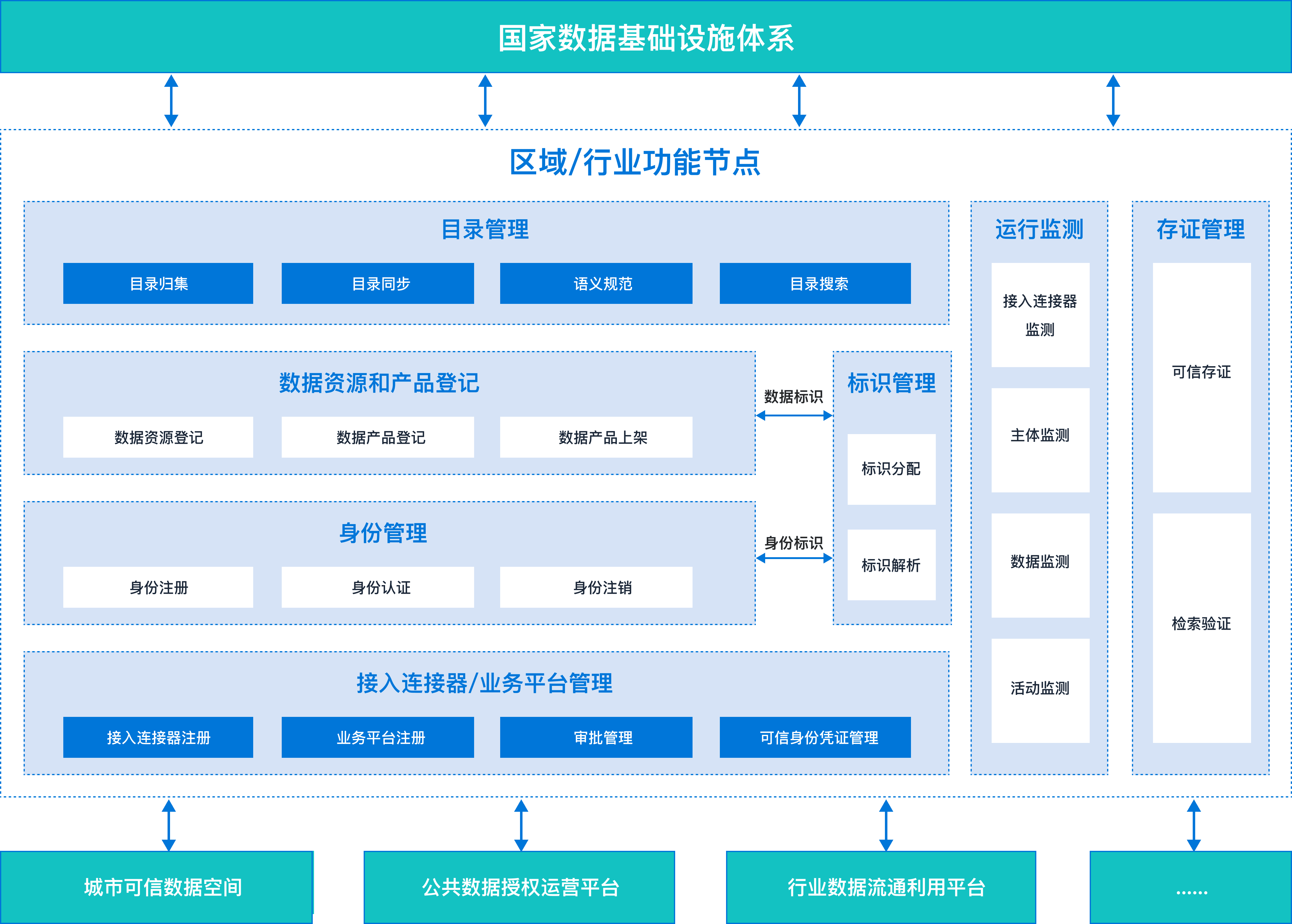 平台可作为数据基础设施建设中的区域功能节点,提供统一身份、目录、接口,实现数据统一接入、身份统一注册、标识统一分配,完成数据要素的全域流通互认。