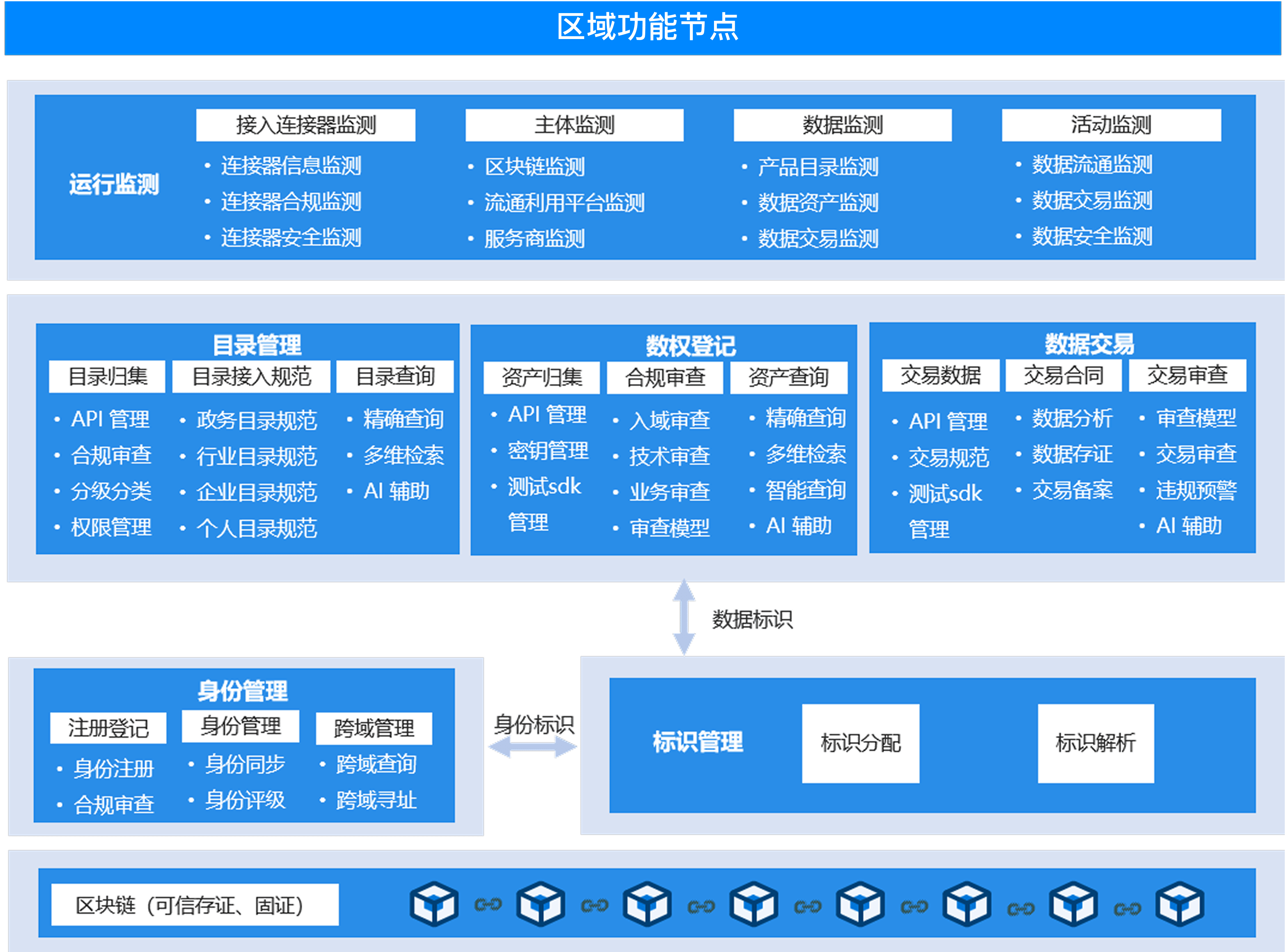 区域/行业功能节点基于开放网络,连接海量数据主体,依托隐私计算、区块链、数据使用控制、数据安全等技术,实现数据的低门槛接入、大规模流通、高效安全利用等目标。平台提供统一目录标识、统一身份登记、统一接口要求、订单管理、交付管理等功能,具备数据流通设备接入管理、流通管控、跨域支撑能力,面向各类数据流通利用技术路线提供统一支撑,实现数据跨域互联互通。